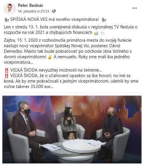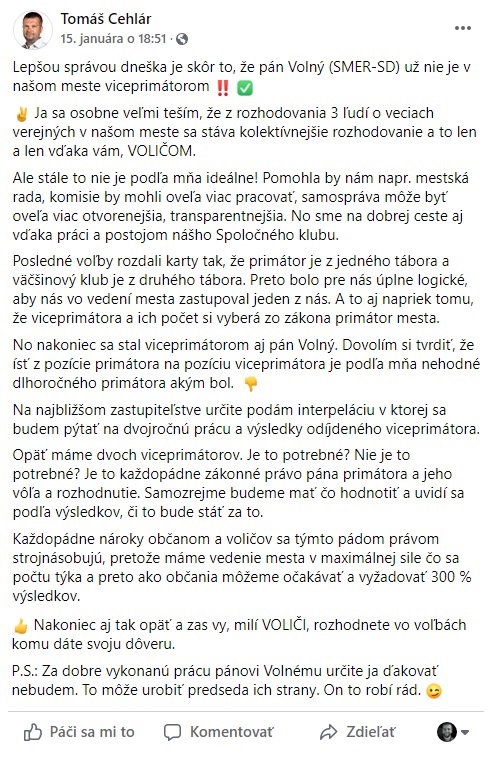 Začiatkom nového roka prišiel ďalší príspevok, kde lynčuje primátora za ponechanie postu druhého viceprimátora a opäť nešetrí financie v tejto ťažkej dobe. Na toto rozhodnutie primátora reagovali aj ďalší jeho kolegovia. Tí rovnako konštatovali, že sú dvaja viceprimátori veľa a financie na druhého viceprimátora sa mohli využiť inak.