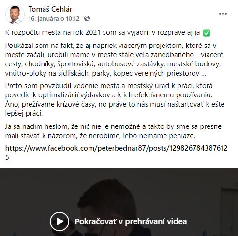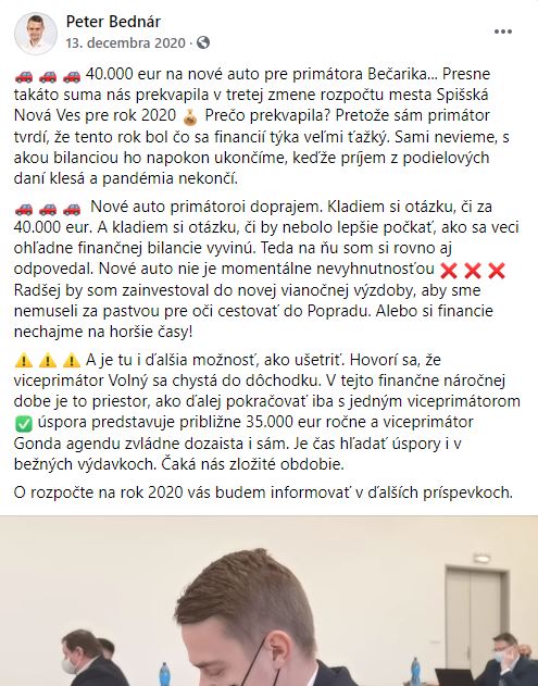 Prvé, čo mi vybehlo na sociálnej sieti, je video jedného poslanca, ktorý sa na decembrovom zastupiteľstve sám natočil ako sa mu nepáči položka nového auta pre primátora, ktorá mala byť zahrnutá do rozpočtu na nový rok 2021. Poskytol aj riešenie, kde by sa hodilo tých 40 000 eur. Napríklad na nové vianočné osvetlenie. Dobre teda, nech sa reprezentant nášho krásneho mesta vozí po Slovensku na svetielkujúcom sobovi. Čo je ale podstatné, vo videu sa zabudol zmieniť, že nakoniec za túto položku zahlasoval a teda schválil túto investíciu do nového auta! Dokonca všetci poslanci mali možnosť návrh rozpočtu pripomienkovať, mali k nemu až 3 stretnutia! Nikto nič. To by totiž neprinieslo žiadne politické body pre vlastný osoh.